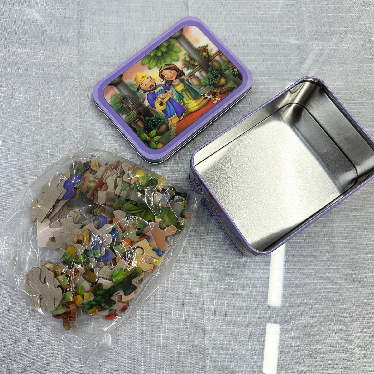 Viene en una práctica y resistente lata metálica color lila, perfecta para guardar las piezas y conservarlas en excelente estado.