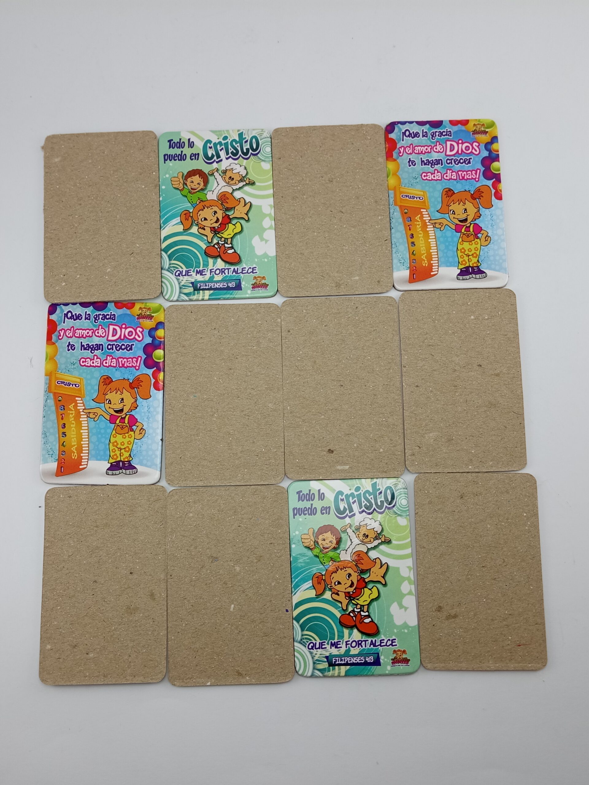 Cada par incluye frases y versículos que animan la fe y los valores cristianos.