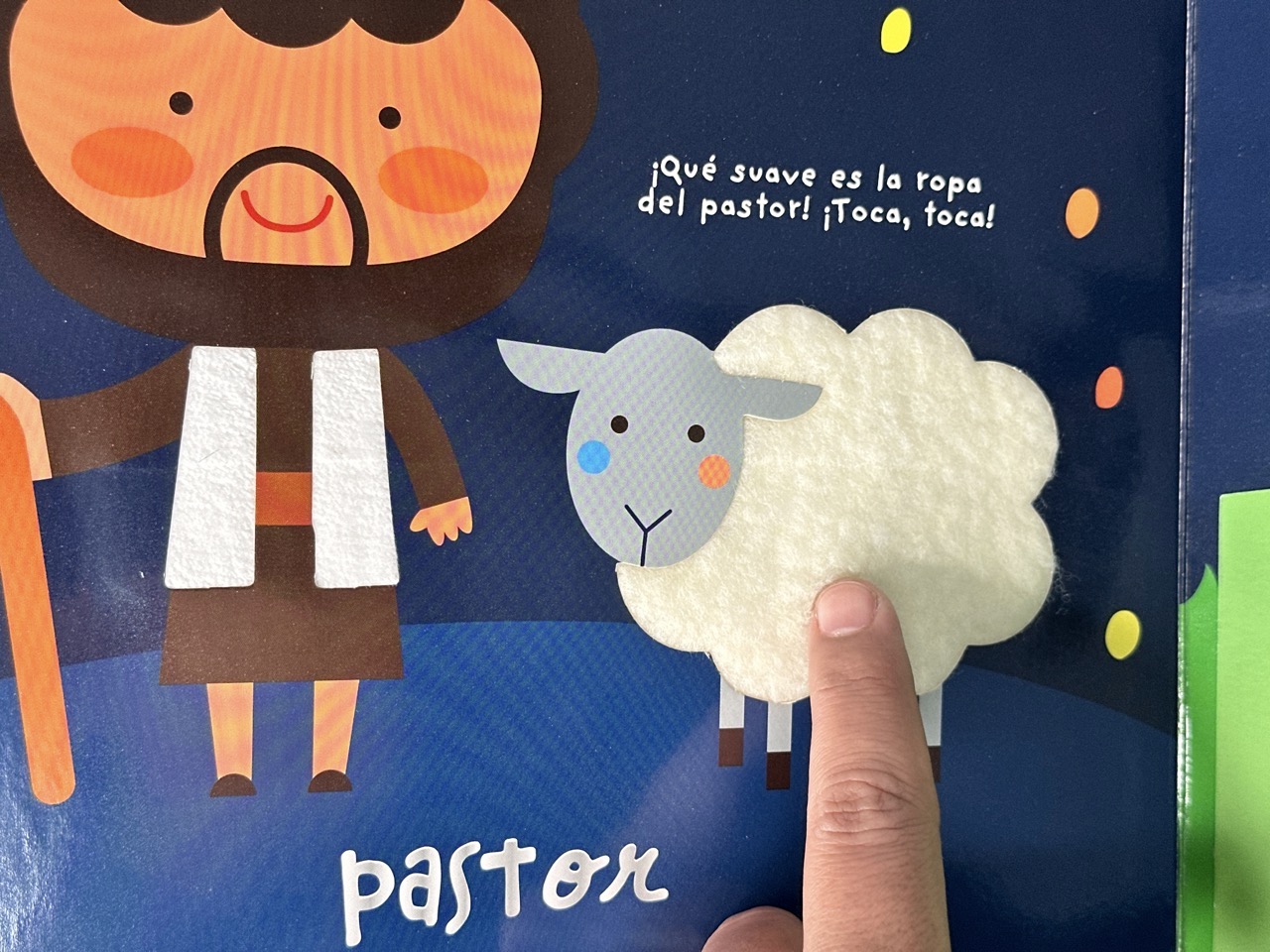 A través de ilustraciones tiernas, colores suaves y superficies táctiles, los niños descubrirán que Jesús es el Buen Pastor que cuida, protege y acompaña siempre.